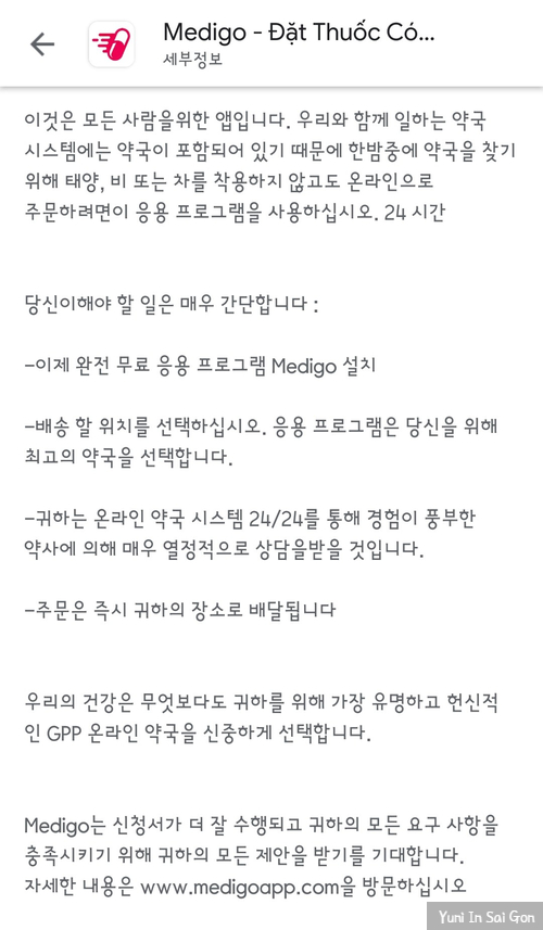 오늘은 머리가 넘나 아파 두통약이 필요한데 도무지 집안에서는 그 흔한 타이레놀 한알이 보이지 않아 약국을 찾아야만 했다. 당장 구글지도에 Nha Thuoc(약국)을 검색하면 내가 살고 있는 근방에도 약국 수십여곳이 검색되지만 뗏기간이 겹치고 대부분 상점들이 문을 닫았을 이 시간에 무턱대고 약국을 찾아다닐 수도 없는 노릇.. 그래서 지난번에 한번 써봤던 베트남 약국배달 어플을 다시 한번 이용해보기로 했다. 요즘 번역기는 정말 잘 나오는구나. 앱스토어에서 Medigo를 검색하면 이와 비슷한 어플들이 수루루루룩 나올 것.