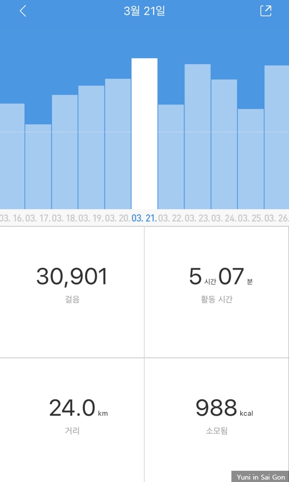 필자는 오전엔 업무를 진행해야하고 오후에는 햇볕이 뜨거워 야외활동이 불가능하기에 가급적 오전5시~6시 사이 기상해 1시간30분~2시간여 걷기를 진행했다. 통상 10000보를 걷는데 소요되는 시간은 1시간20분 남짓이다.