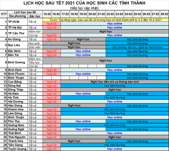 이 밖에도 코로나19 방역대책으로 뗏이후 휴교 및 온라인수업으로 전환한 호치민시는 14일 이상 신규 확진자가 발생하지 않으면서 3월 1일부로 모든 학생들이 다시 학교에 등교하게 될 예정입니다. 한국은 삼일절 휴일 개꿀인데 말이죠.