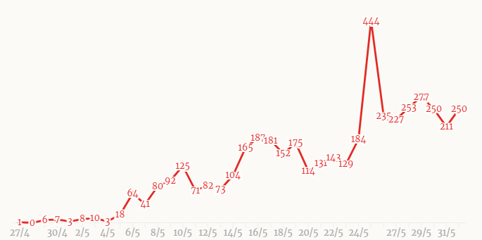 6월 1일 베트나 신규 지역감염사례는 총 250건으로 이 가운데 박장성이 124건으로 전체 절반을, 호치민이 70명으로 사상 최고치를 기록했습니다. 이 밖에도 메콩델타 동탑성에서 신규 확진자가 발생하며 4월 27일 4차 확산이후 지역감염발생 지역은 전국 37개 성·시로 늘었고 총누적지역감염자수는 4496명으로 늘었습니다.