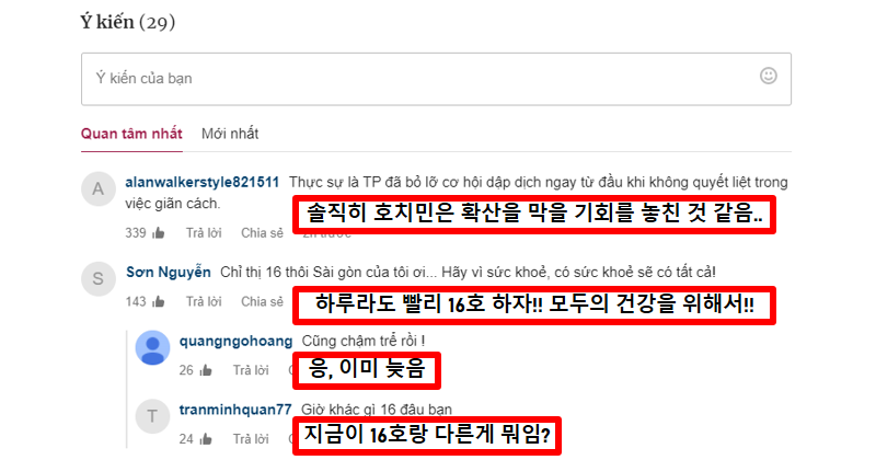 한편 지속적으로 호치민시 확진자가 증가하고 있다는 뉴스에 베댓이 흥미로워 가져와 번역해봤습니다. 사실 현재 시행중인 고강도 사회적 거리두기에 지쳐있을거라 생각했는데 이와 달리 많은 사람들이 방역수칙 격상을 요구하는 모습이네요.