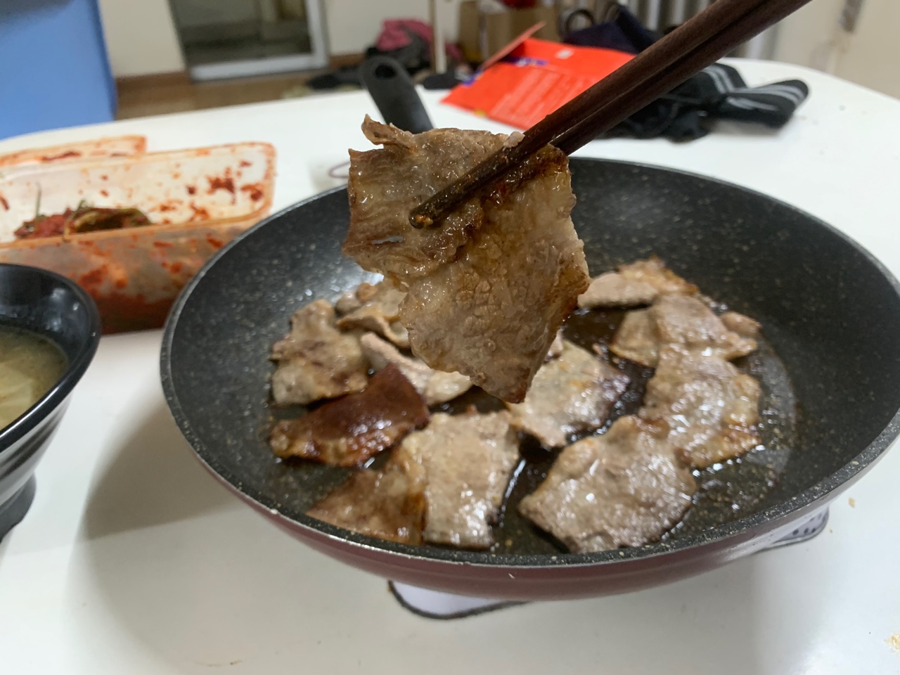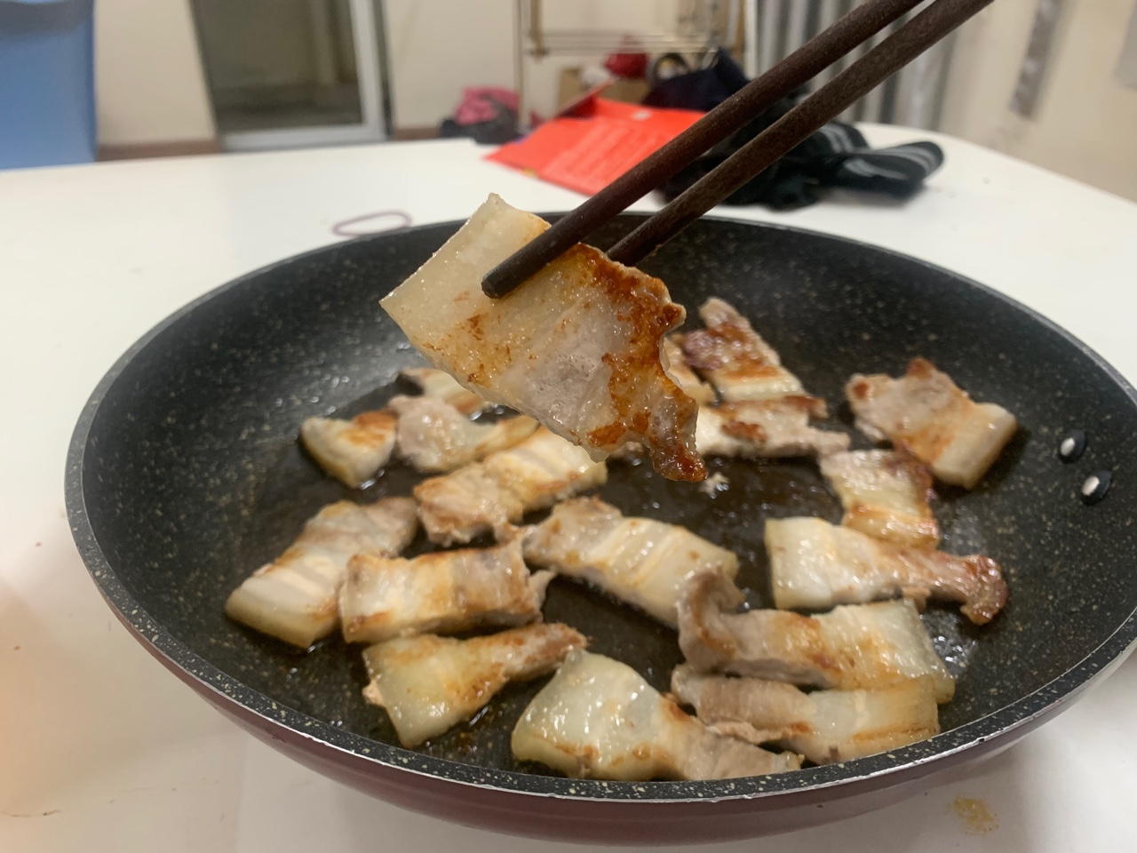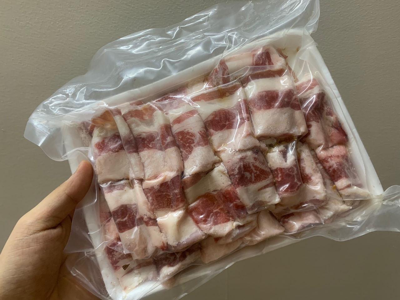 뜻이 있는 곳에 길이 있다고 했던가요? 아파트 봉쇄로 마트를 갈 수 없는 상황이지만 페이스북을 통해 수입냉동삼겹살 약 5kg을 구매하는데 성공했습니다. 그렇게 받아온 고기는 냉동된채로 한때 유행했던 냉삼두께로 썰어 구워먹었습니다. 아오 이날 정말 행복했습니다.