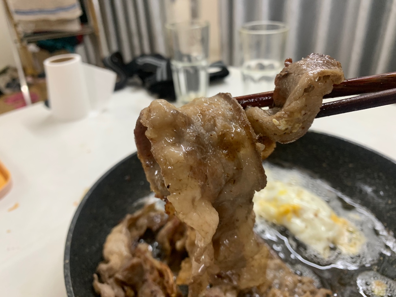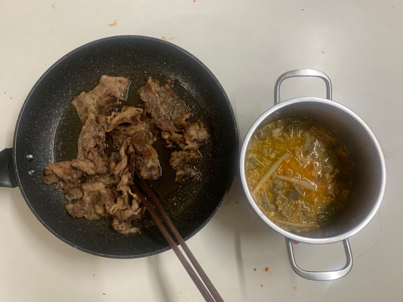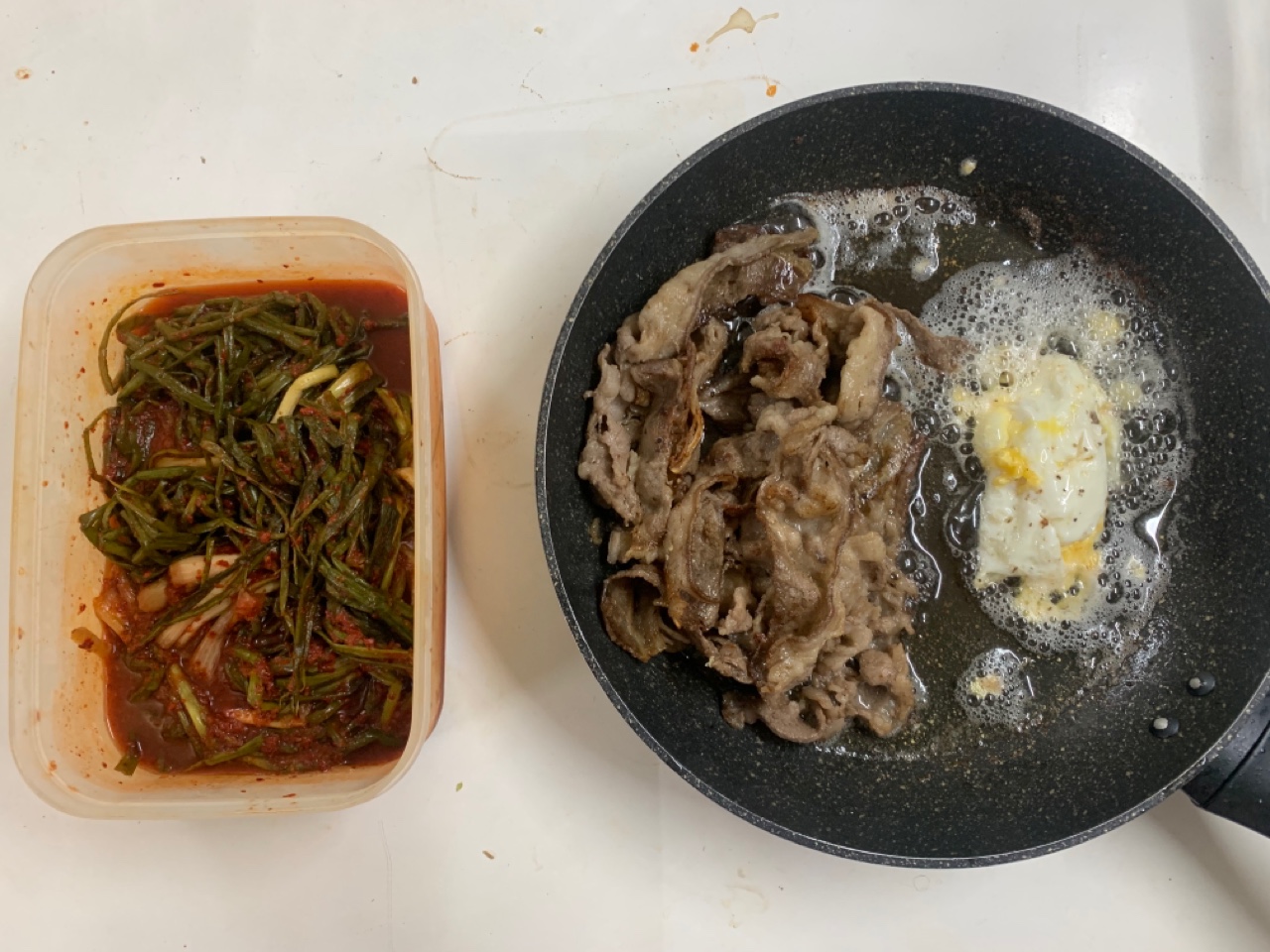 그리고 25일의 메인 식사로는 지방지방한 우삼겹입니다. 지방분포보니 단백질 섭취가 조금 부족할 것 같아 우삼겹 볶고 나온 기름에 계란을 부쳐먹었는데.. 사실 소기름은 국밥에 넣어먹는게 제일 맛있었네요. 계란부칠땐 라드유가 최고인 것 같습니다.