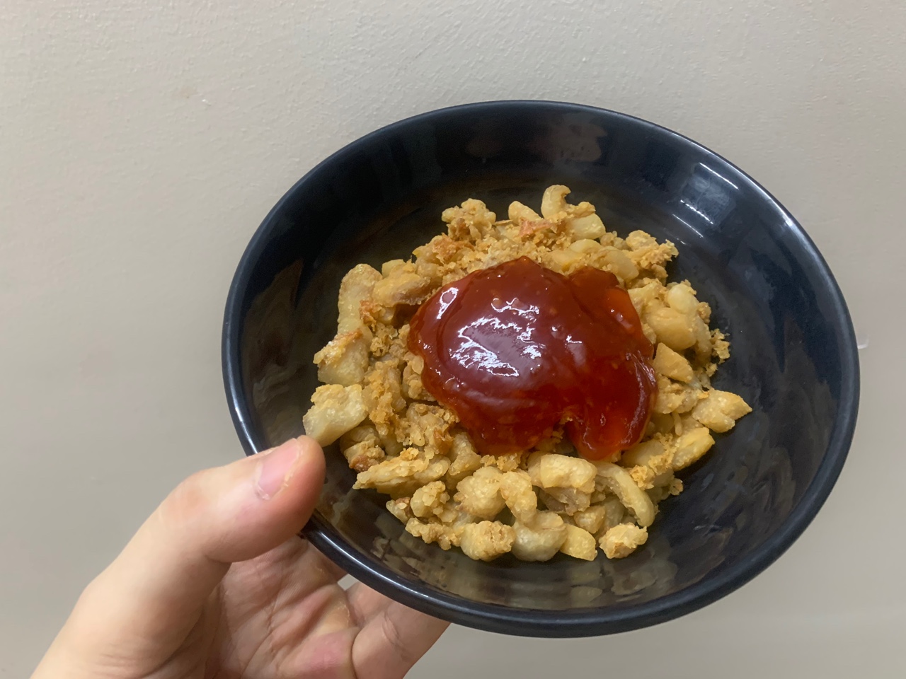 냉동고에 얼린 돼지비계가 있길래 라드유도 만들고 치킨양념에 돼지비계튀김 섞어먹으면 치킨느낌도 나겠다 싶어서 만들어봤던 간식입니다만... 탄맛이 많이나 거의 다 버렸습니다.. 제길..