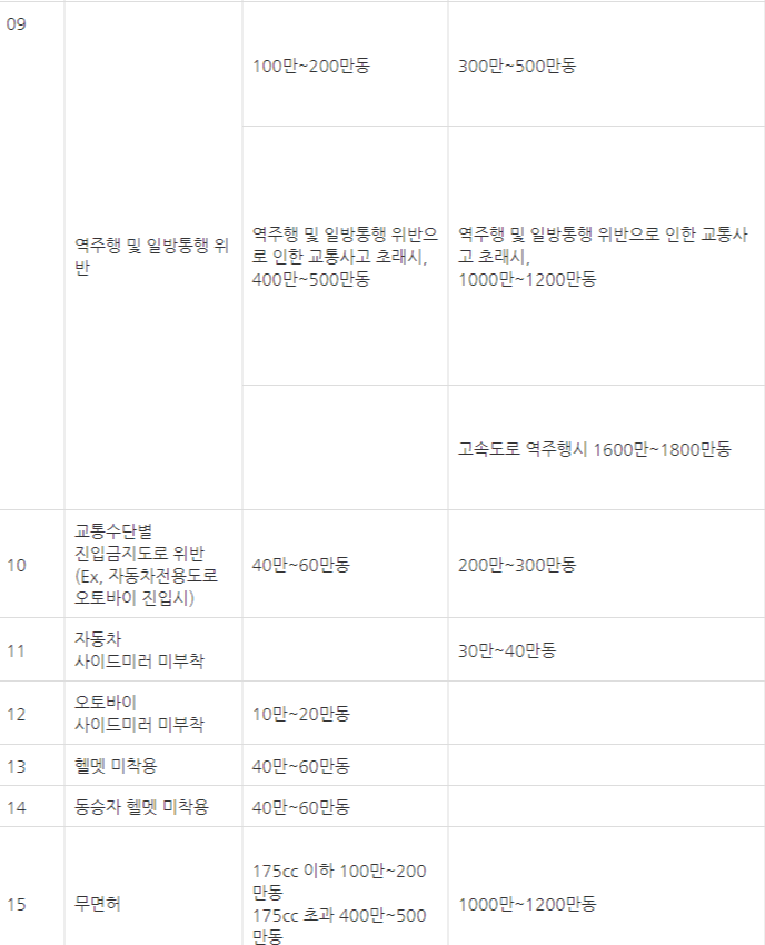 2021년 도로교통법 개정법률 의정 123호에 의하면 교통법규 위반과 그에 따른 벌금은 아래와 같습니다.