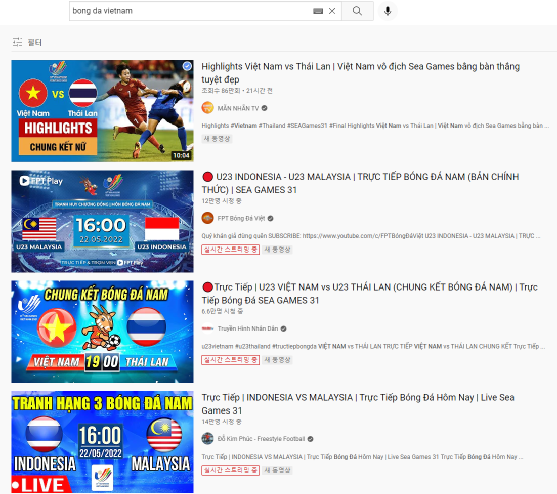 유튜브 검색창에 'Bong da vietnam(베트남 축구)' 정도만 검색하시면 아래와 같이 생중계하는 채널들을 쉽게 찾아보실 수 있는데요.