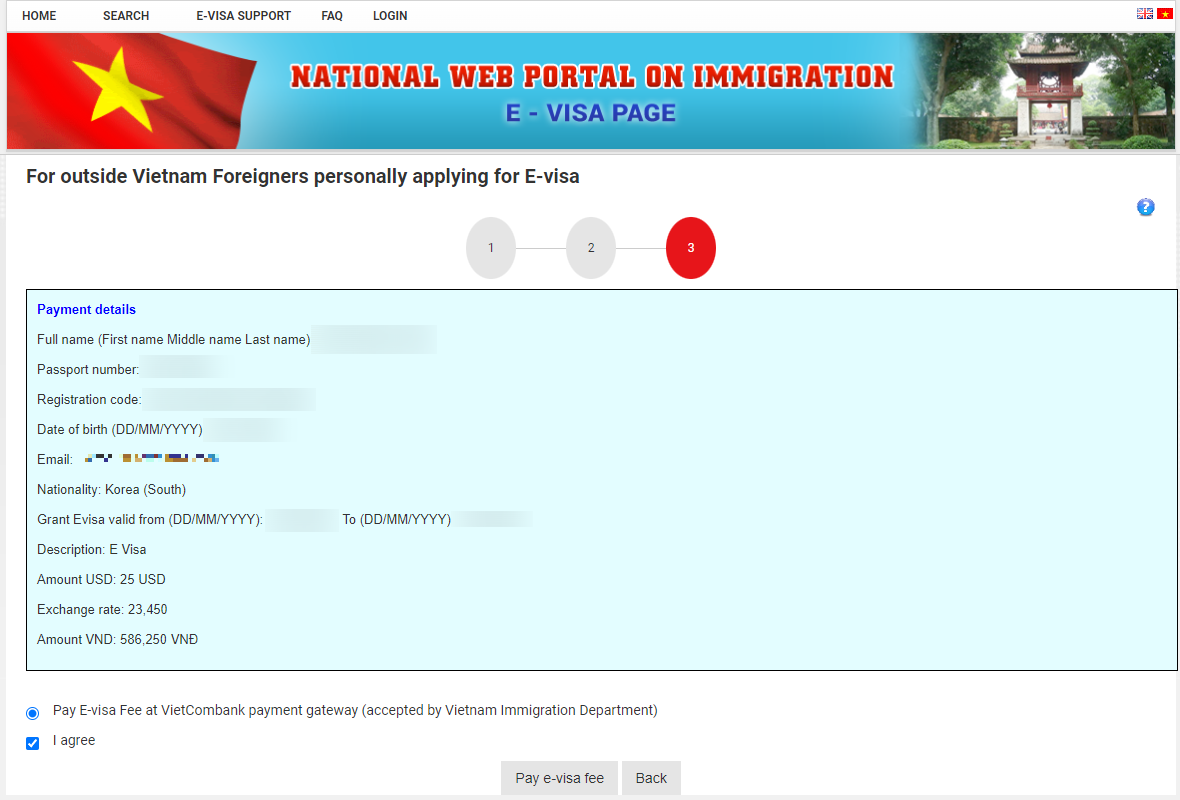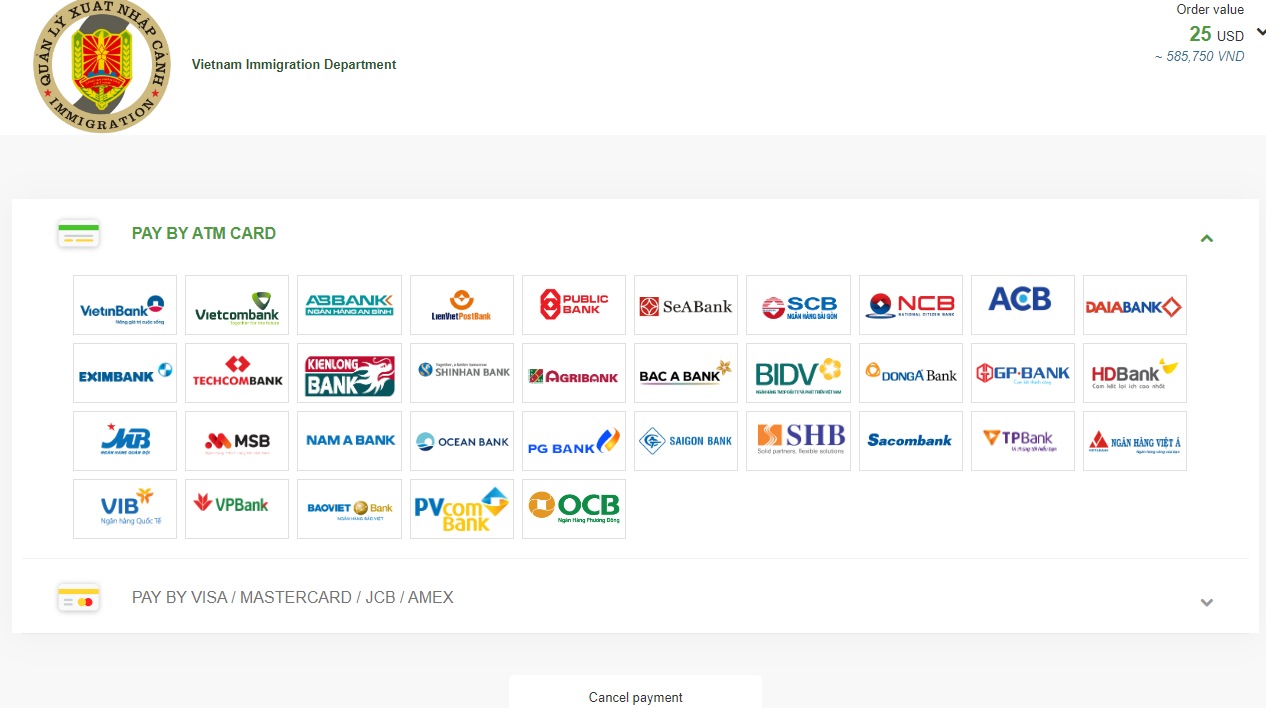 비자신청비용은 25불이며, 이를 베트남동으로 환산한 금액이 최종 결제액입니다.