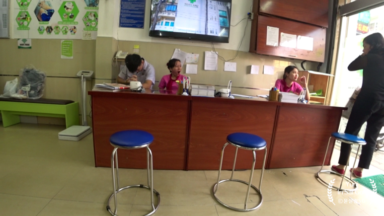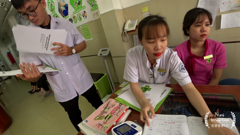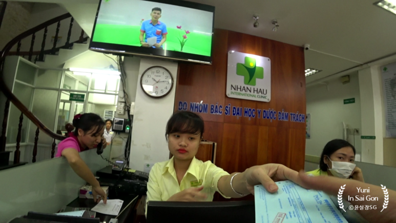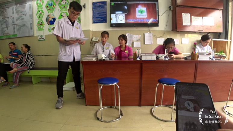 베트남에서 일일 내원하는 환자수가 꽤 괜찮게 있다면, 환자를 핸들링하는 이런 직원들이 배치되어 있습니다. 남녀노소 가리지 않고, 직접 전부다 핸들링하더군요. 저기 왼쪽에 서 있는 안경 쓴 친구가 제 신체검사 전반을 다 도와줬습니다.