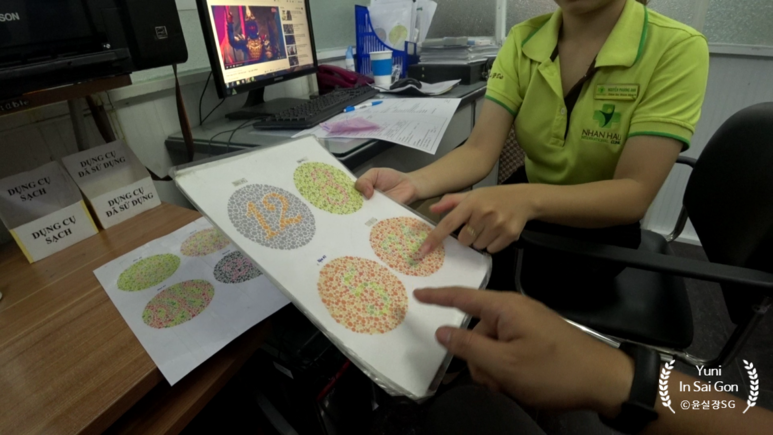 그 다음은 색약/맹 테스트인데, 크게 어려운건 없구요. 이때도 궁금했던건 전 베트남어로 읽었지만, 만에 하나, 영어를 모르는 직원을 만난다면 이 난관을 어떻게 해치워 나갈 것인지 다소 궁금증이 들곤 하더군요. 보이는 숫자를 펜으로 써서 소통할까요?